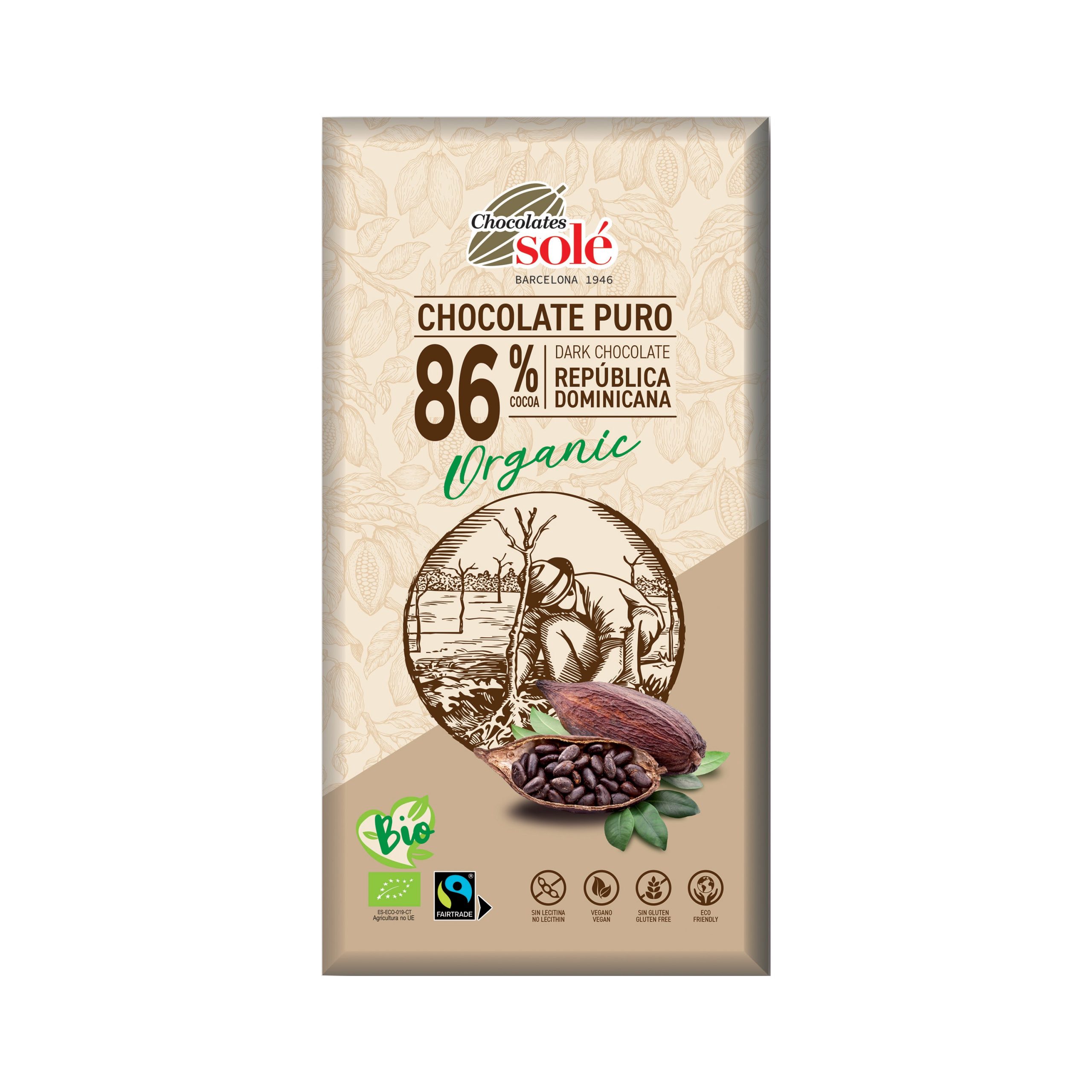 Tato výtečná čokoláda obsahuje velmi vysoký podíl špičkového dominikánského bio kakaa a přírodní třtinový cukr z Brazílie. Ovoněná je pouze čistou vanilkou a neobsahuje žádné emulgátory. Je určena milovníkům poctivých vysokoprocentních hořkých čokolád. Bio čokolády značky SOLÉ na sobě nesou logo FAIR TRADE. Fair trade – spravedlivý obchod – garantuje farmářům z rozvojových zemí spravedlivou odměnu a zakazuje otrockou a dětskou práci. Tyhle do poslední kostičky vymazlené čokolády má na svědomí rodinná firma ze Španělska, která propojuje tradiční řemeslo s moderními trendy. Výrobě čokolád se navíc věnují už od roku 1946. Suroviny pochází z ekologického zemědělství a dbají na fair trade principy. Na všech čokoládách si navíc smlsnou i bezlepkáři.