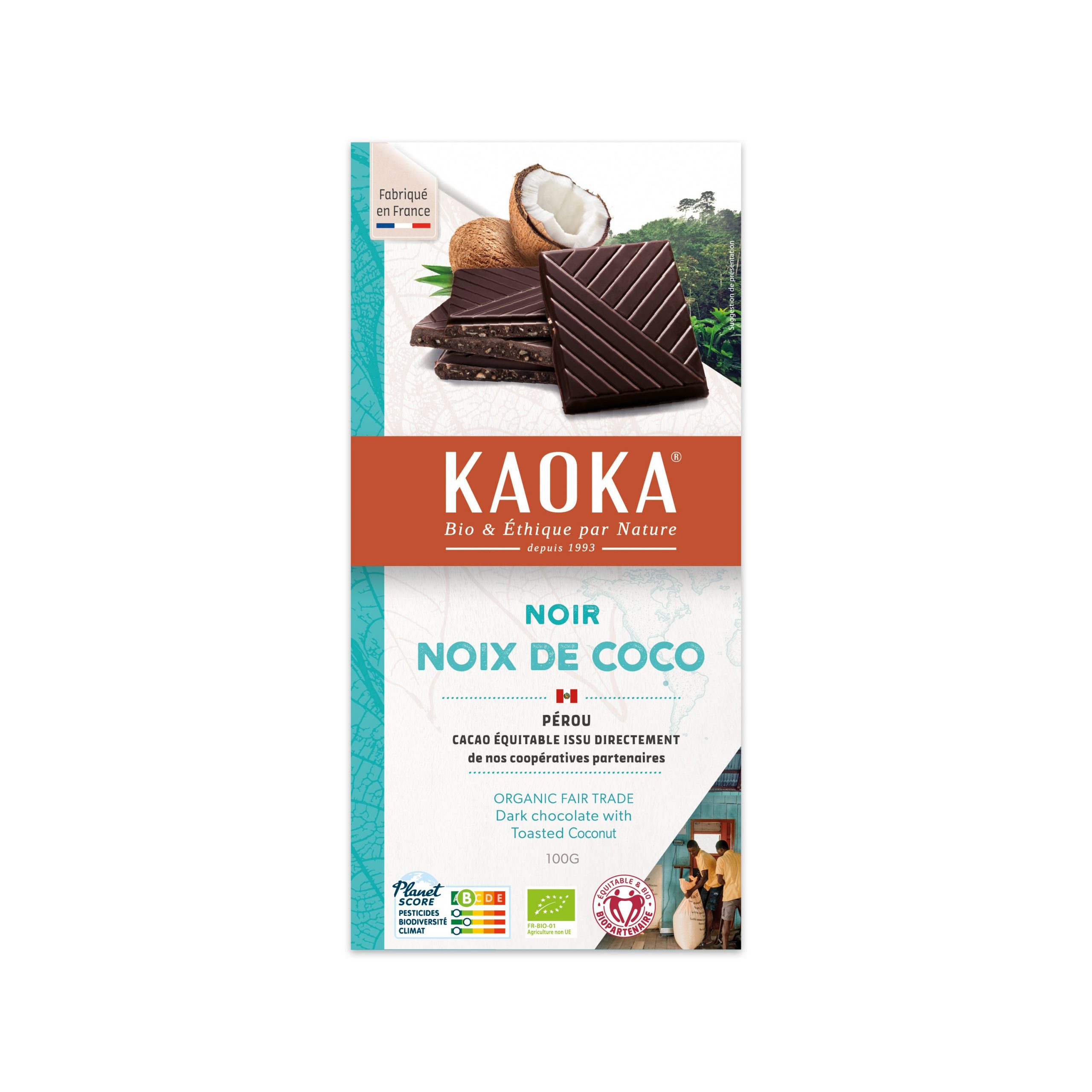 Výrazná hořká čokoláda s praženým kokosem. Použité kakaové boby pocházejí ze Svatého Tomáše a Princova ostrova. Většina složek pochází z fair trade projektu Bio Equitable. Fair trade – spravedlivý obchod garantuje farmářům z rozvojových zemí spravedlivou odměnu a zakazuje otrockou a dětskou práci. Čokoška, která je BIO, férová, kvalitní, a ještě k tomu dostupná? Je to tak, francouzské značce Kaoka se povedlo nevídané. Ale nebylo to ze dne na den, všecko ladí už přes 30 let. Zakladatel, André Deberdt, byl dokonce průkopníkem BIO a fair trade už v koncem sedmdesátek. Dodnes je však firma rodinná a zajímá ji blaho nejen vašich chuťových pohárků, ale také zemědělců i přírody obecně.