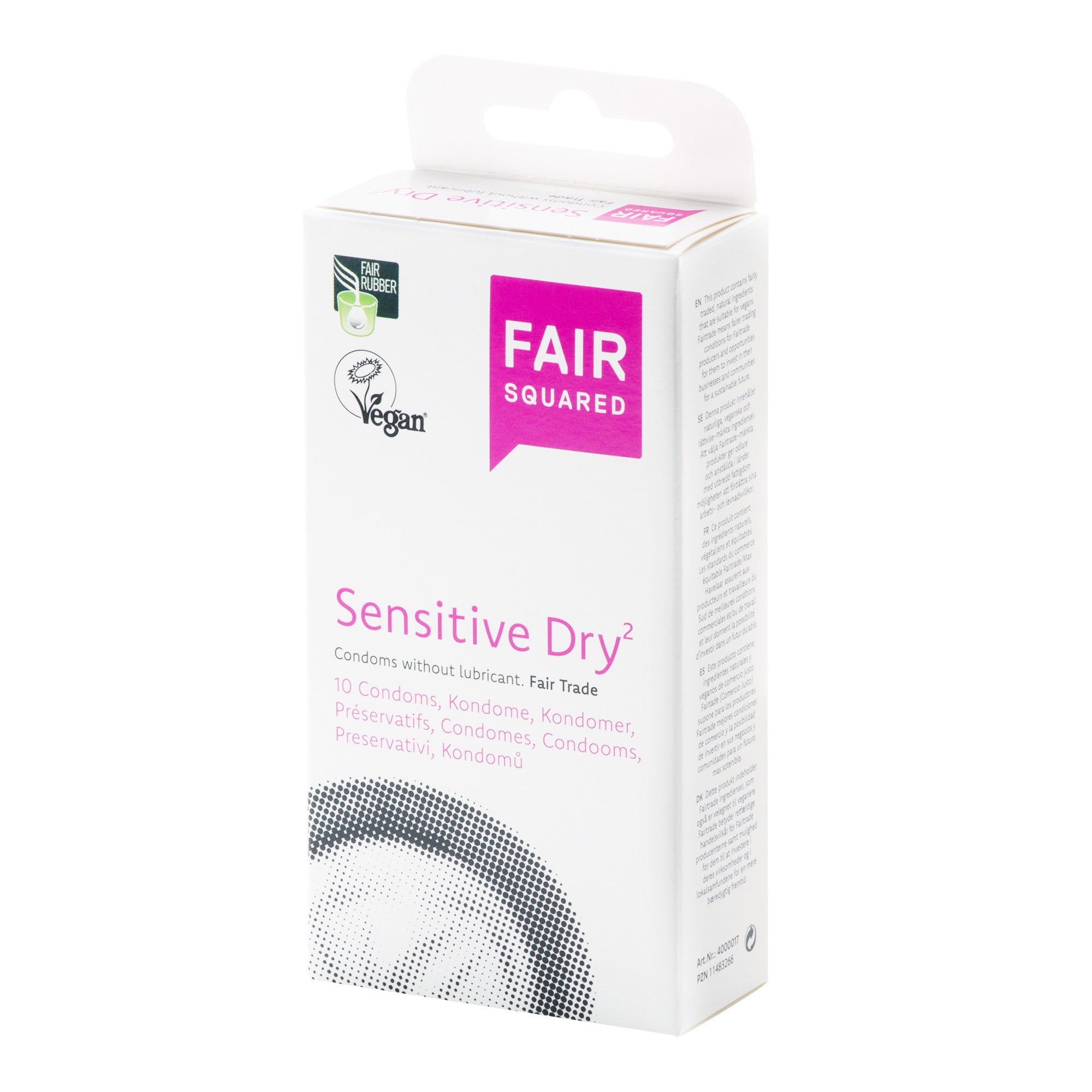 Kondomy sensitive dry představují pohodlnou a účinnou ochranu před pohlavními chorobami i nechtěným těhotenstvím. Kondomy jsou fair trade, veganské, z přírodního latexu. Nejsou parfemované a jsou bez příchuti. Fair Squared je rodinná firma z Kolína nad Rýnem s vysokým cílem – změnit svět k lepšímu. Jejich kosmetické a hygienické výrobky s přírodními ingrediencemi hrdě nesou certifikaci Fair Trade a férovostí jsou skutečně protknuty. Od způsobu pěstování surovin, přes zpracování, až po kvalitu výsledného produktu přistupují ohleduplně a s respektem k pracovníkům, zákazníkům, planetě i zvířatům. V jejich výrobně najdete meruňkový a mandlový olej z Pákistánu, přírodní latex z Indie či marocký arganový olej. Produkty jsou vhodné pro osoby s citlivou pokožkou i vegany.