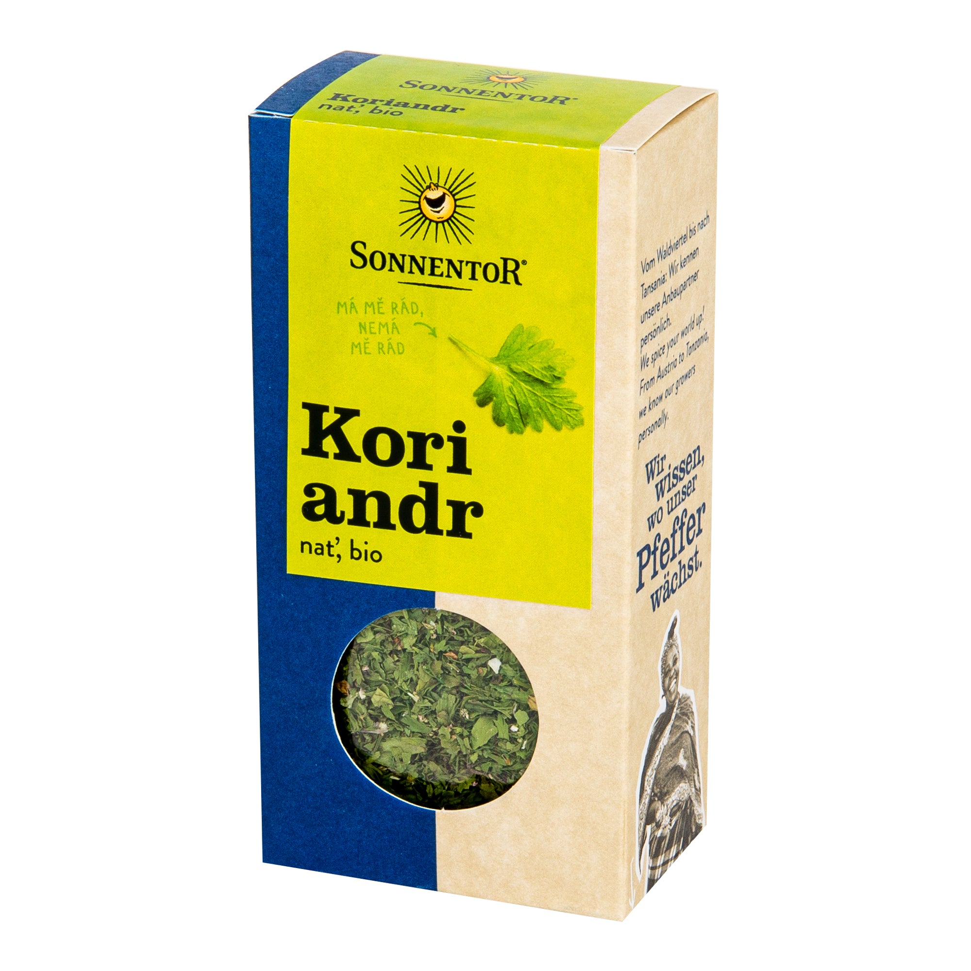 Sušená nať koriandru dodá vaší kuchyni další chuťový rozměr. Vykouzlíte s ní zajímavé asijské pokrmy i ozvláštníte českou klasiku. Česko-rakouská značka Sonnentor nás svým přístupem uvádí v obdivný úžas. Průkopník ve výrobě bioproduktů svými lahodnými čaji i voňavým kořením rozdává radost už přes čtvrt století. Es má přitom tahle srdcová značka plný rukáv. 100% BIO kvalita každé ingredience. Šetrné zpracování a velký díl ruční práce. Kompostovatelné materiály, minimalizace odpadů a uhlíkové stopy. Obdivuhodně transparentní a férová spolupráce s farmáři. To jsou jen střípky inspirativní práce, kterou tým Sonnentoru dělá svět lepším místem. Nezaměnitelná značka přeměňuje obyčejný hrneček s čajem v symbol naděje, že poctivou prací v souladu se Zemí skutečně můžeme pomoci následujícím generacím k lepší budoucnosti.