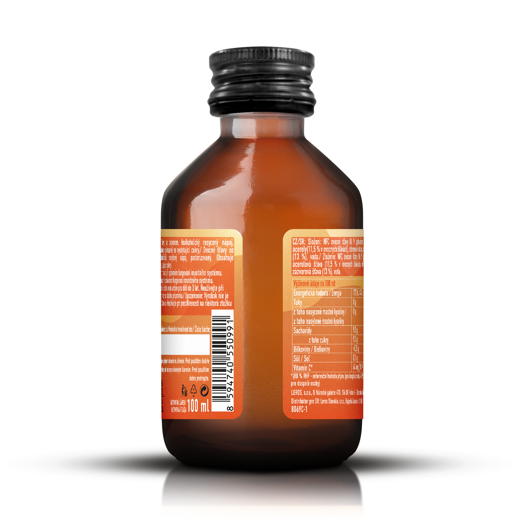 - Složení: NFC ovocné šťávy 86 % (jablečná šťáva, šťáva z aceroly, (11,5 % v ovocných šťávách), citronová šťáva), zázvorová šťáva (13 %), voda.