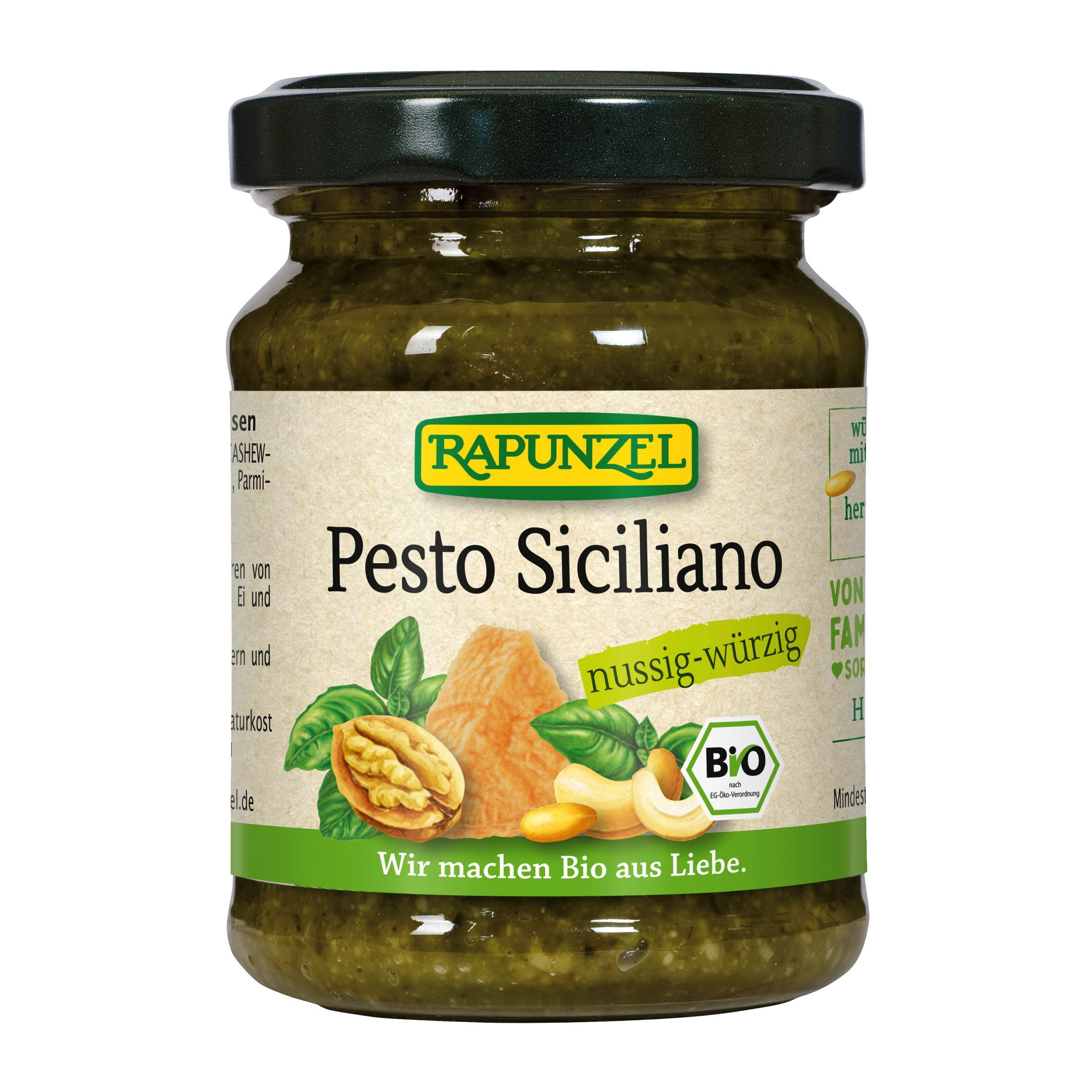 Toto výběrové pesto je vyráběno podle tradičního italského receptu a vyniká velmi vysokým podílem ořechů a čerstvé bazalky. Dochuceno je pravým parmezánem, ovčím pecorinem a trochou česneku. Pesto siciliano používáme hlavně na těstoviny, ale i na pizzu, toasty, do salátů a omáček. Jeden z předních výrobců biopotravin v Evropě Rapunzel přišel na trh v roce 1974. Od počátku dbá na to, aby suroviny pocházely z ekologických zemědělství, která o půdu pečují tak, aby dávala plodiny i budoucím generacím. Dnes má v portfoliu téměř 600 vegetariánských produktů – od oříškových másel a müsli až po oleje či luštěniny.