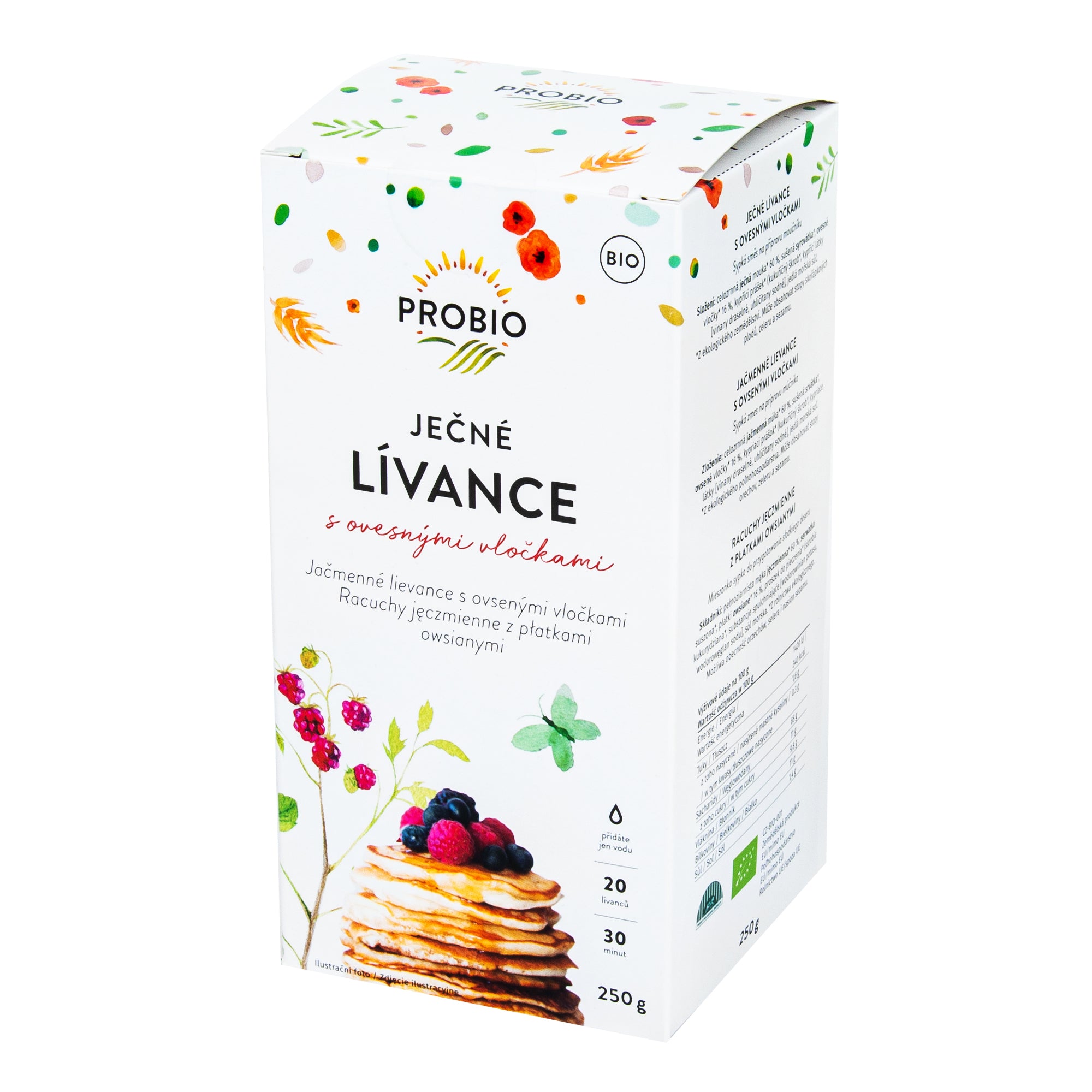 Směs na lívance, která má skvělé složení – obsahuje celozrnnou ječnou mouku, ovesné vločky, je bez cukru, oslazena syrovátkou. Příprava je velmi snadná – směs se pouze smíchá s vodou a lívanečky se smaží na oleji. Psal se rok 1992, kdy na český trh vstoupilo PROBIO a stalo se prvním a největším výrobcem biopotravin v republice. V sortimentu má dnes přes 1500 položek, provozuje vlastní mlýny, balírny i sklady a hospodaří na ekologické farmě na jižní Moravě. Nabízí základní biopotraviny (mouky, luštěniny, těstoviny,…) i pochutiny (sušenky, čokolády,…).