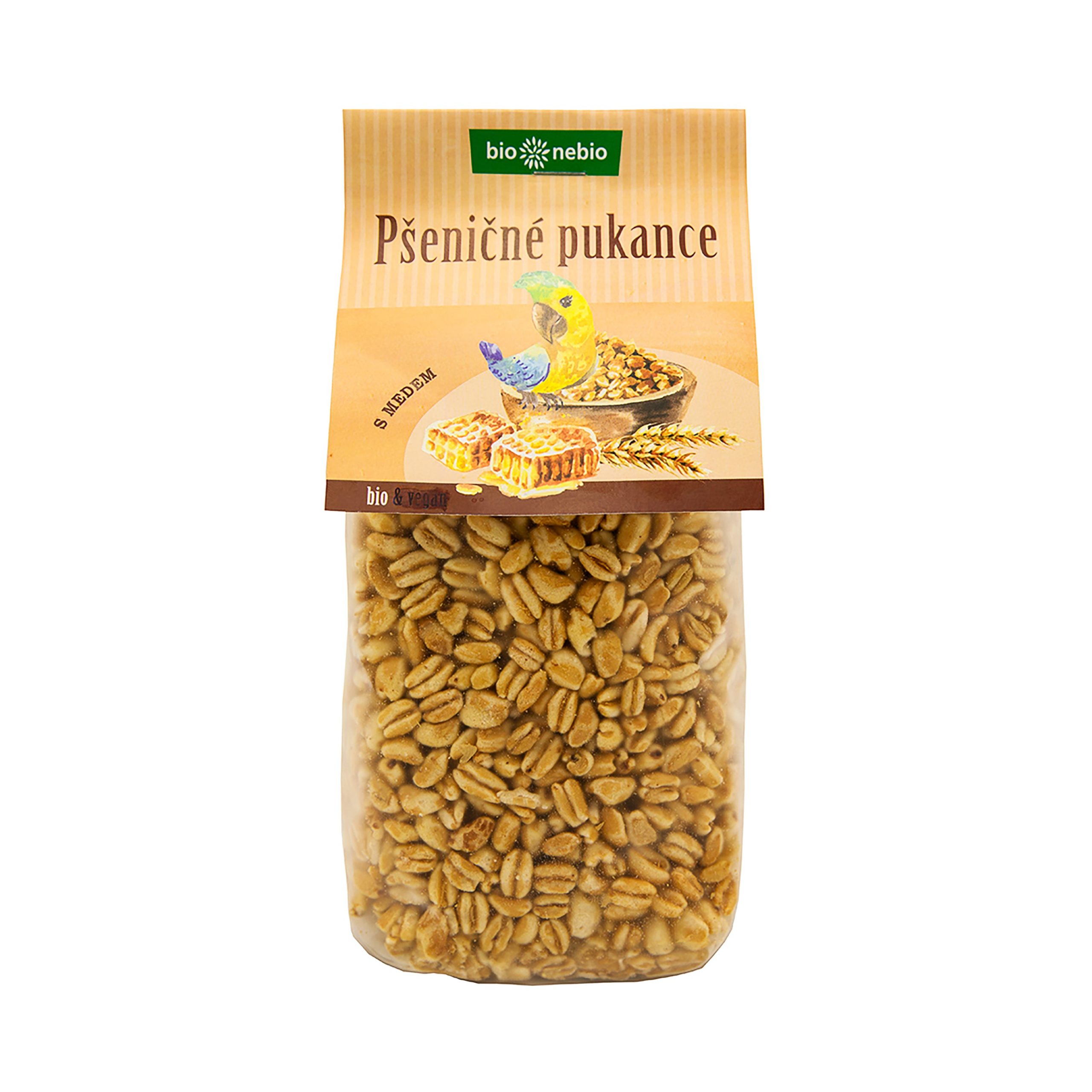 Celé pufované pšeničné zrno je lehce oslazeno medem. Vynikající k snídani s mlékem či jogurtem, do různých müsli směsí nebo jen tak samotné či s čerstvým ovocem.. TIP: Vynikající jsou pukance zalité mlékem a javorovým sirupem!. Čeští Bio nebio vám kryjí záda, když chcete ukuchtit něco dobrého z kvalitních surovin, stejně jako když si chcete rovnou zamlsat bez příprav. Kvalitní potraviny nabízí už dobrých 20 let – smlsnou si na nich vegani, bezlepkáři i všichni nadšenci do zdravé chutné stravy. A navíc jsou BIO a fér.