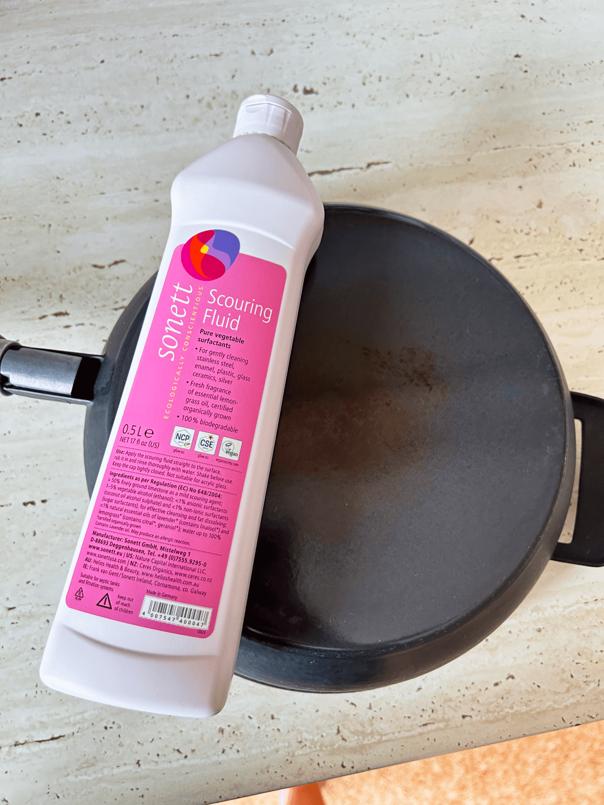 - Složení: Jemně mletý uhličitan vápenatý ze Švábských Alp (> 50 %), rostlinný denaturovaný alkohol (ethanol) (1-5 %), deriváty kokosového oleje a cukrového smáčedla (1 – 5 %), BIO esenciální oleje z levandule a citrónové trávy (< 1 %), voda (do 100%).
