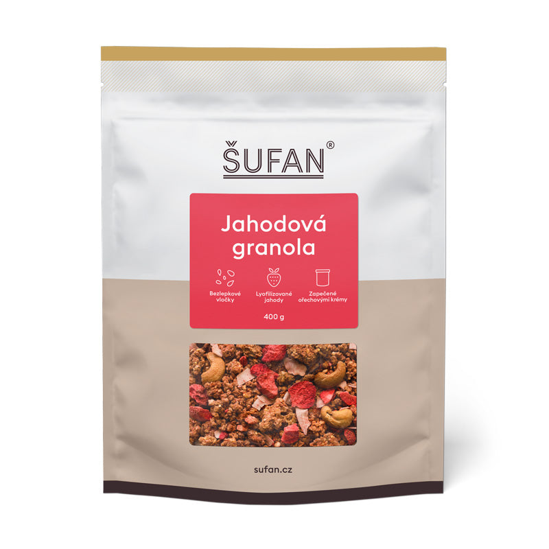 Jahodová granola od Šufanu je křupavou lahůdkou, která vás přenese do letních dnů plných slunce a čerstvých jahod. Užijete si každé sousto, díky větším kouskům jahod, kokosových plátků, semínek, pufovaných jáhel a kešu ořechů. Lyofilizované jahody jsou nabité chutí i výživou, připomínají právě utržené ovoce. Kešu ořechy jsou velké, bílé a krásně smetanové, což přináší do směsi bohatou a hebkou chuť. Granola je zapékaná s ořechovým máslem a jemně oslazená medem, což jí dává přirozeně sladkou chuť bez konzervantů a barviv. Bezlepková směs je skvělá do jogurtu, s mlékem nebo na posypání oblíbených kaší, a nabízí výživu plnou chuti pro vaše tělo i mysl. V receptuře najdete med. Pokud dáváte přednost veganskému složení, nakoukněte do našeho virtuálního regálu s granolami a vyberte si eko libůstku s čistě rostlinnými ingrediencemi. Matějovi a Markovi chybělo na českém trhu stejně lahodné ořechové máslo, jaké ochutnali při toulkách Amerikou. A tak v roce 2014 začali vyrábět vlastní. Od té doby se portfolio značky Šufan rozrostlo o další dobroty, přísný dohled nad kvalitou ale zůstal stejný. Zakladatelé pravidelně navštěvují rodinné farmy v Česku i zahraničí, kontrolují kvalitu sklizní a oříšky pak zpracovávají ve vlastní šetrné pražírně.