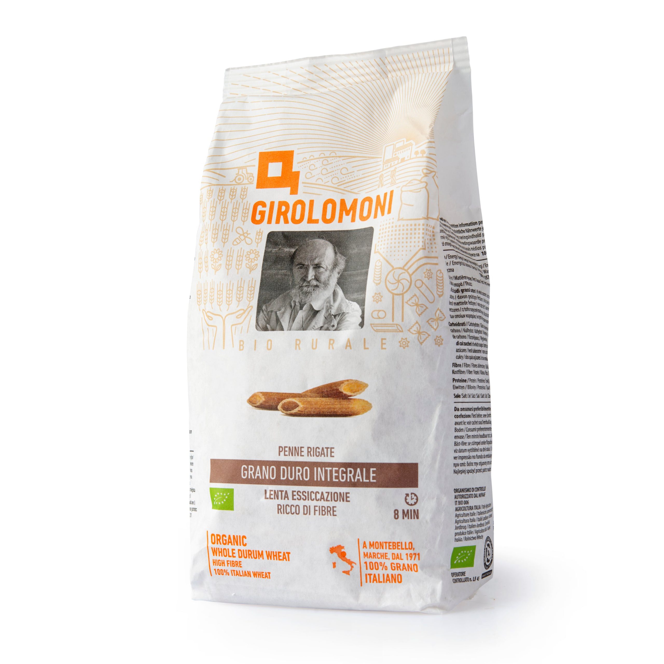 Vynikající italské těstoviny ze semoliny, tvrdozrnné pšenice. Všechny produkty Girolomoni jsou vyrobené výhradně ze surovin pěstovaných ekologicky. Těstoviny se pak pomalu suší, aby se zachovaly jejich nutriční hodnoty, chuť a vůně. S Girolomoni ochutnáte pravou Italii, fakticky, netaháme vás na vařené nudli. Italský starosta Gino Girolomoni už 50 let nazpět prosazoval návrat k poctivému hospodaření – začal pěstovat BIO tvrdozrnnou pšenici a vyrábět první celozrnné těstoviny v Itálii. Když mu vláda házela klacky pod nohy tím, že celozrnné těstoviny jsou škodlivé, nelámal to přes kolínko. Zadařilo se a jeho dokonalé těstoviny si můžete naservírovat i dnes. Kromě semoliny neobsahují ani ťuk.